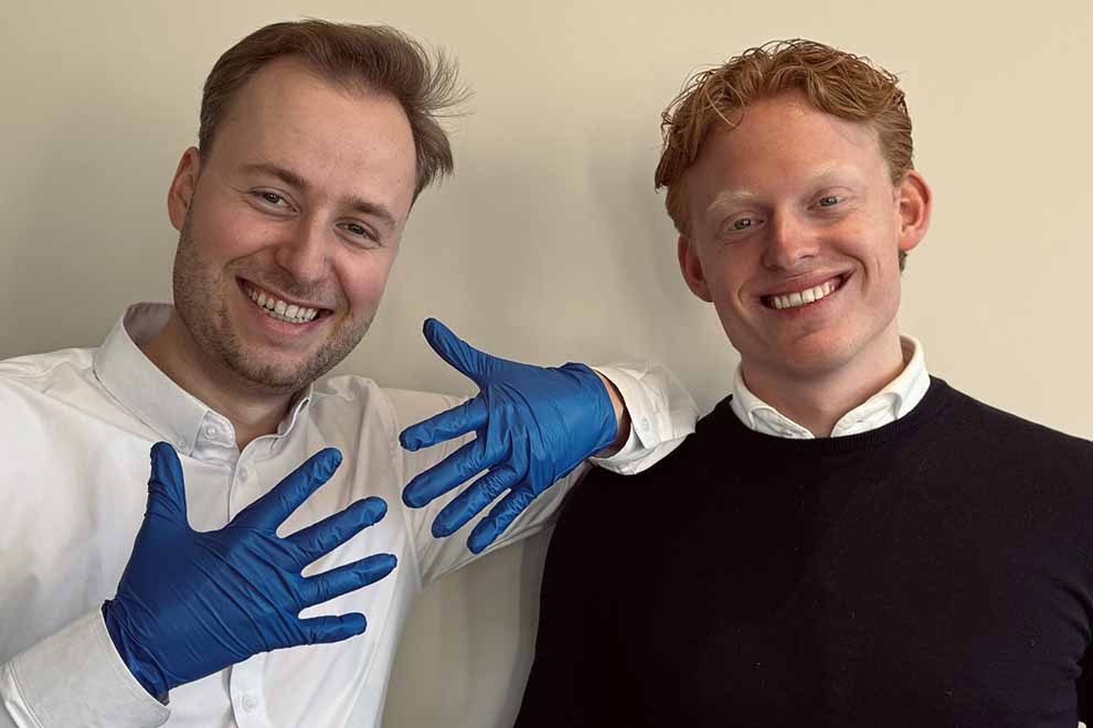Matz van Noesel (rechts op de foto) : “Tijdens de coronaperiode zagen we dat er enorm veel wegwerphandschoenen werden gebruikt die vervolgens allemaal werden verbrand. Dat moest anders kunnen, vonden we. We zijn ons dus gaan afvragen met welke grondstoffen je een alternatief zou kunnen maken. Dat hebben we gevonden, samen met de vader van Thijs die in de chemie werkt.”
